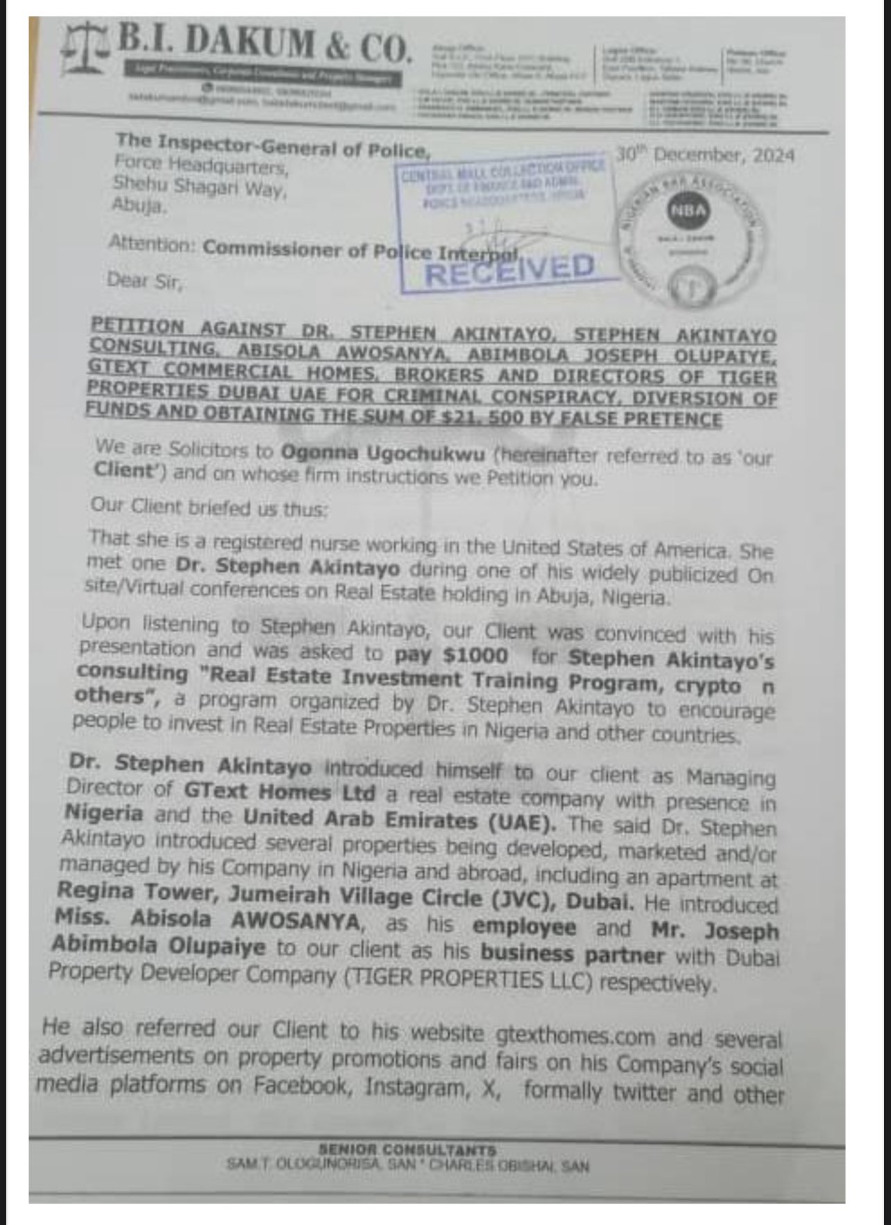 The petition, dated December 30, 2024, detailed how Ms. Ogonna was lured into a real estate investment scheme for a one-bedroom apartment at Regina Tower, Jumeirah Village Circle (JVC), Dubai, after attending a widely publicized seminar hosted by Dr. Akintayo.