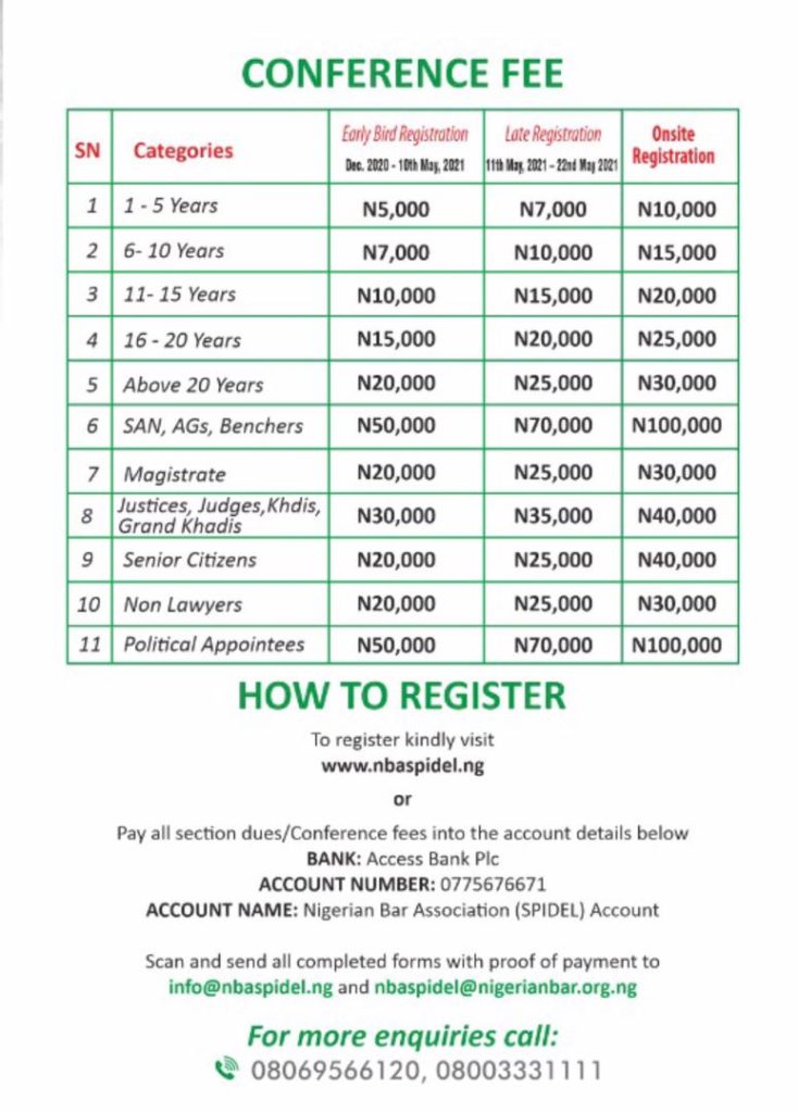 A statement by Messrs Emeka Nwadioke and Sylvester Udemezue, Chairman and Secretary respectively of the Media & Publicity Sub-committee, noted that the CPC extended the early bird window from May 10 to May 17, 2021. “This is to enable many lawyers and stakeholders who are keen to attend the eagerly awaited annual conference to do so,” the statement said. “Accordingly, the schedule of fees for the early bird window will remain till May 17, 2021.”