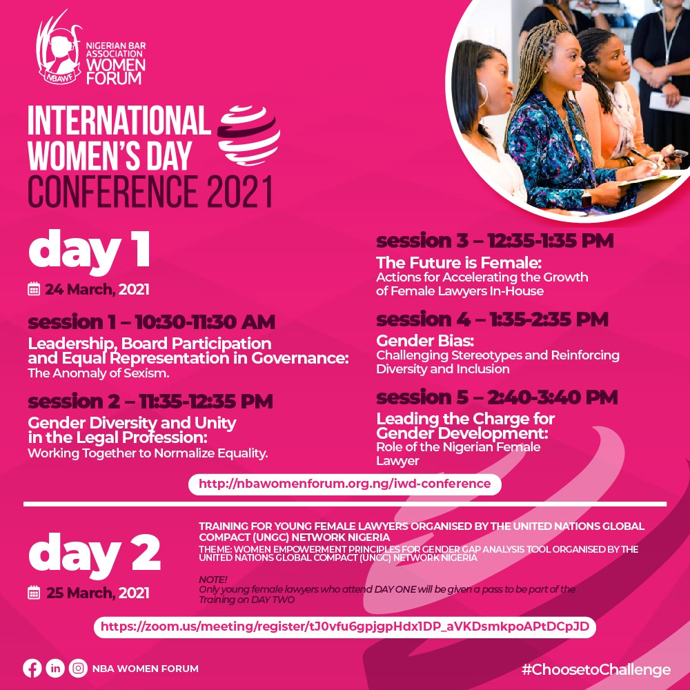 Day two of the conference will feature a special training for young female lawyers, organized by the United Nations Global Compact (UNGC) Network Nigeria (UNGC) with the theme: