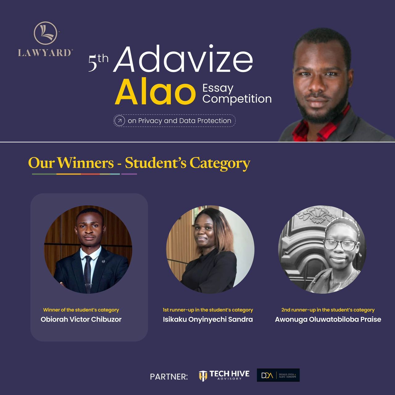The Adavize Alao Essay Competition on Privacy and Data Protection is held annually in honour of Lawyard co-founder, Adavize Alao, who passed on in August 2019 following a brief illness. Fondly remembered by many, Alao was passionate about privacy and data protection as an emerging area of practice and was completing a graduate degree in Data Protection & Intellectual Property at the University of Hertfordshire at the time of his demise. The university post-humously conferred the degree on Alao in December 2019.