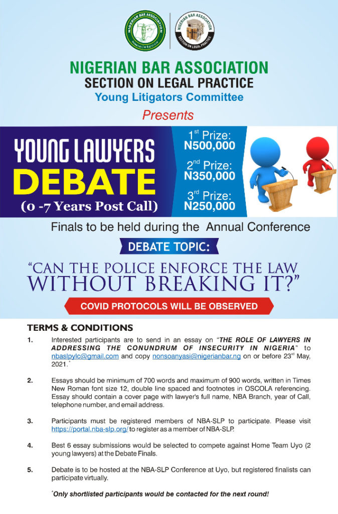 The NBA-SLP young litigators committee presents the young lawyers debate, inviting participants between 0-7 years post call to be hosted at the NBA-SLP conference at Uyo, Akwa Ibom state.