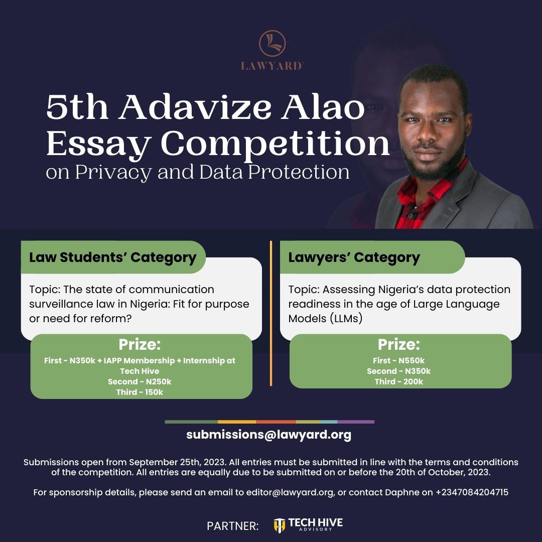 In memory of our co-founder, Adavize Alao, Lawyard calls for submission of entries for the 5th Adavize Alao Essay Competition on Privacy and Data Protection. This competition is open to Lawyers and Law Students in Nigeria.