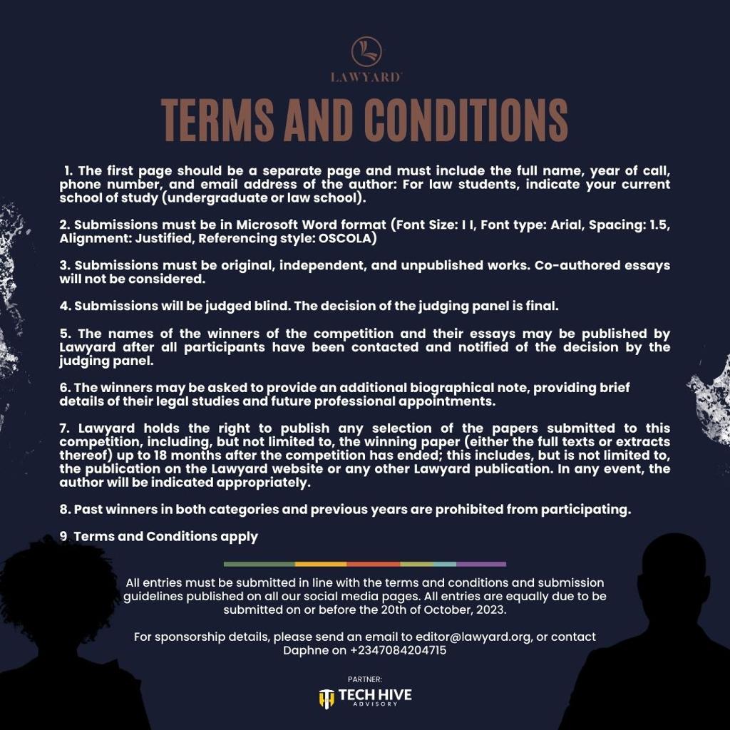 All entries must be submitted to submissions@lawyard.org on or before the 20th of October, 2023 in line with the terms and conditions and submission guidelines. The word count for the Law Students’ category is 1,500 words while the word count for the Lawyers’ category is 2,000 words.
