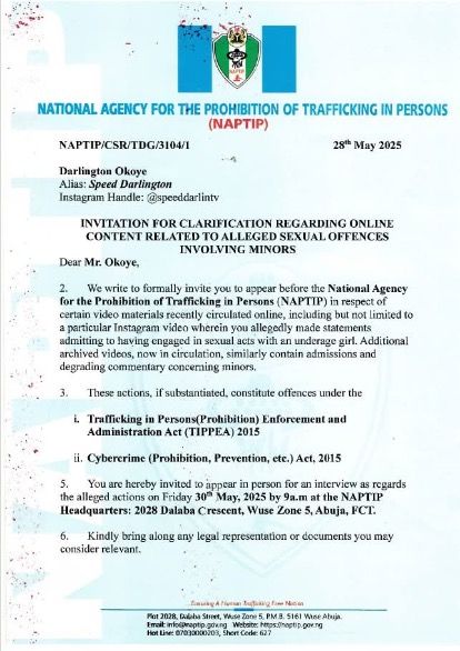The National Agency for the Prohibition of Trafficking in Persons (NAPTIP) has summoned Nigerian singer Darlington Okoye, popularly known as Speed Darlington, to appear at its national headquarters in Abuja.