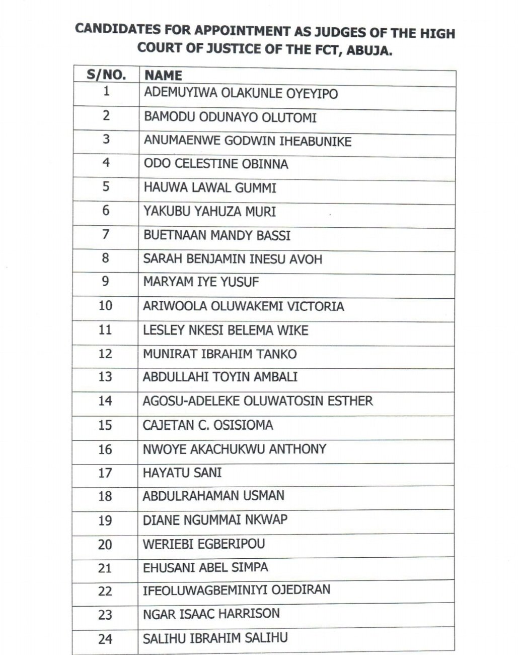 The Chief Judge of the Federal Capital Territory (FCT), as Chairman of the Judicial Service Commission (JSC) of the FCT, has through the Secretary of the JSC-FCT, forwarded to the NBA President the shortlist of candidates for appointment, and requesting him to comment on their suitability or otherwise.
