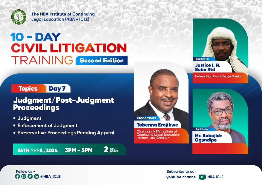 The Nigerian Bar Association’s Institute of Continuing Legal Education (NBA-ICLE) has assembled the distinguished duo of Babajide Ogundipe, one of Nigeria’s most respected lawyers, and Retired Justice Buba, to lead the highly anticipated session on judgement and post-judgement proceedings on the seventh day of the 10-Day Civil Litigation Training.