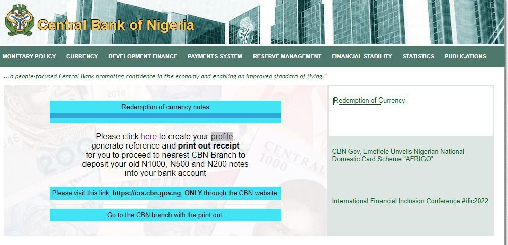 More details: A check on the website by Lawyard showed that the CBN has published a new update titled: ‘redemption of currency’. By clicking on the title, another interface would pop up asking bank customers to click a link “to create your profile, generate reference and print out a receipt for you to proceed to nearest CBN Branch to deposit your old N1000, N500, and N200 notes into your bank account.”