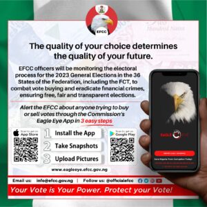 Members of the public are encouraged to report anyone trying to buy or sell votes by making use of the EFCC financial crimes reporting App, Eagle Eye, which is available for download on the Google Play or Apple store.