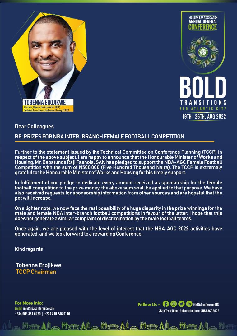 The male and female NBA inter-branch football competitions, planned as part of the 2022 Annual General Conference of the Nigerian Bar Association (NBA), are slated to hold between Thursday, 18th August and Tuesday, 23rd August 2022.