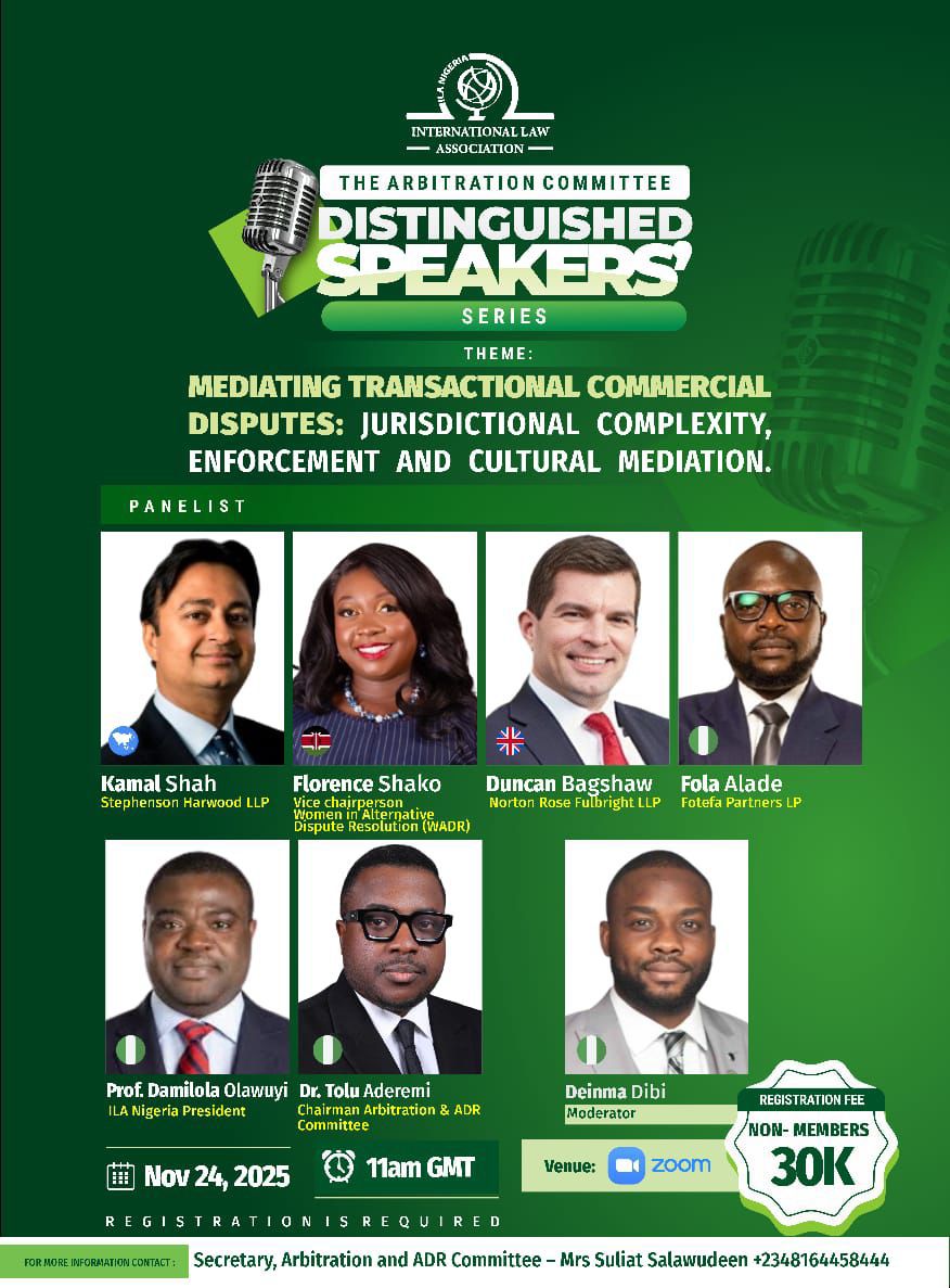 The International Law Association (Nigeria) Arbitration Committee presents a Distinguished Speaker’s Series on “Mediating Transactional Commercial Disputes: Jurisdictional Complexity, Enforcement and Cultural Mediation,” a practical training on navigating forum and enforcement challenges and using cultural mediation to secure durable settlements.