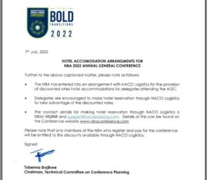 Hotel Accommodation Arrangements For NBA 2022 Annual General Conference
