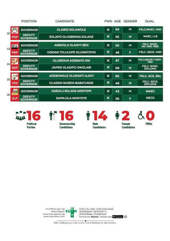 The list includes 16 governorship candidates vying for the position.