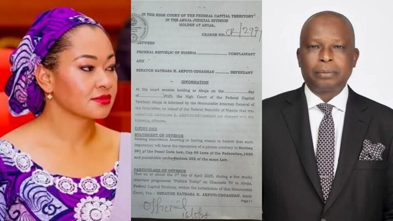 According to the charge which was filed on May 16, 2025, at a Federal Capital Territory High Court and marked CR/297/25, Akpoti-Uduaghan, is accused of making a statement during an appearance on ‘Politics Today’ on Channels TV on April 3, 2025, where she allegedly accused Akpabio and Bello of discussing plans to assassinate her.