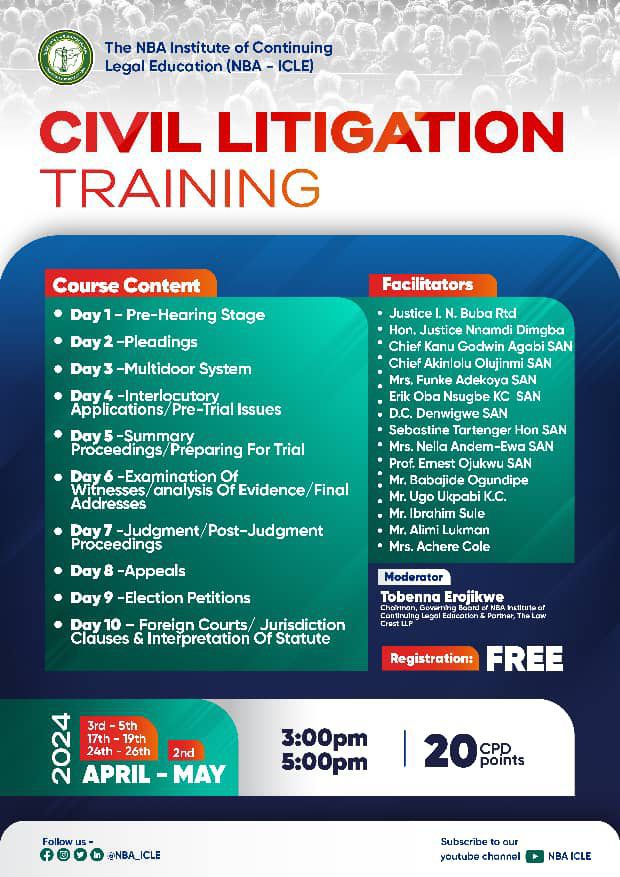 The Nigerian Bar Association’s Institute of Continuing Legal Education (NBA-ICLE) has announced a 10-day Civil Litigation Training programme, set to feature an array of renowned legal practitioners and jurists from Nigeria, the United Kingdom, and Canada.