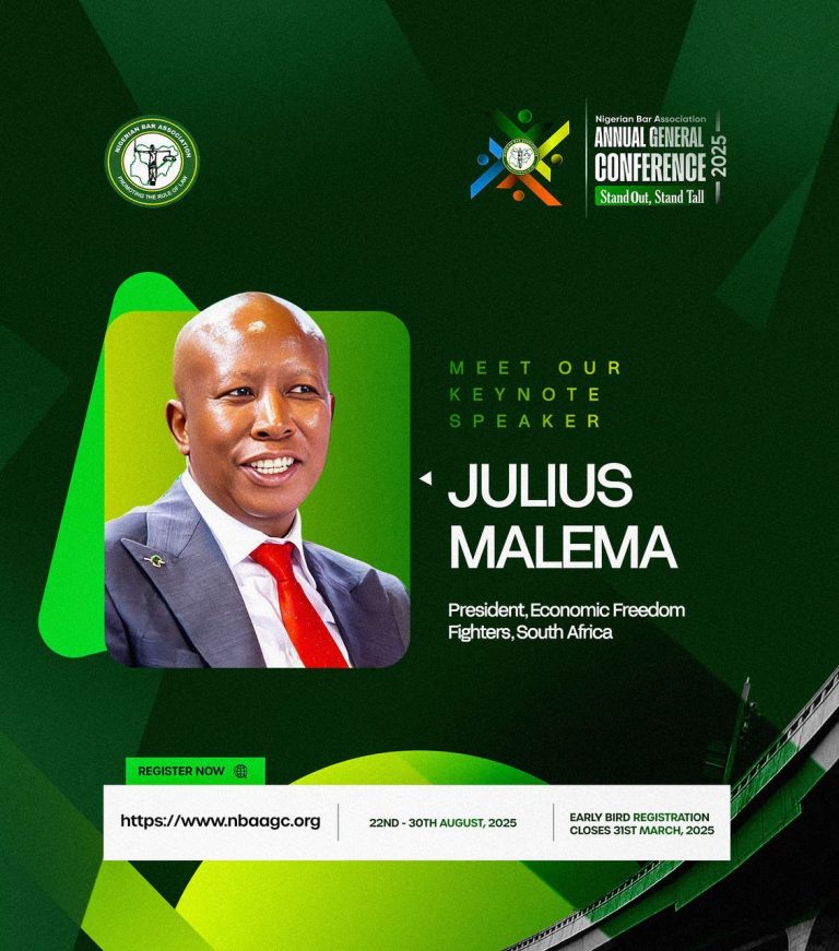 The Nigerian Bar Association (NBA) has officially announced Julius Malema, the President of South Africa’s Economic Freedom Fighters (EFF) known for his populist stance, as the keynote speaker for its 2025 Annual General Conference.