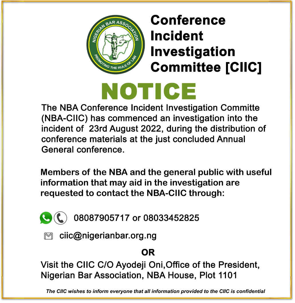 The Nigerian Bar Association Conference Incident Investigation Committee (NBA-CIIC) has commenced an investigation into the incident that happened on 23rd August, 2022, during the distribution of conference materials at the just concluded Annual General Conference.