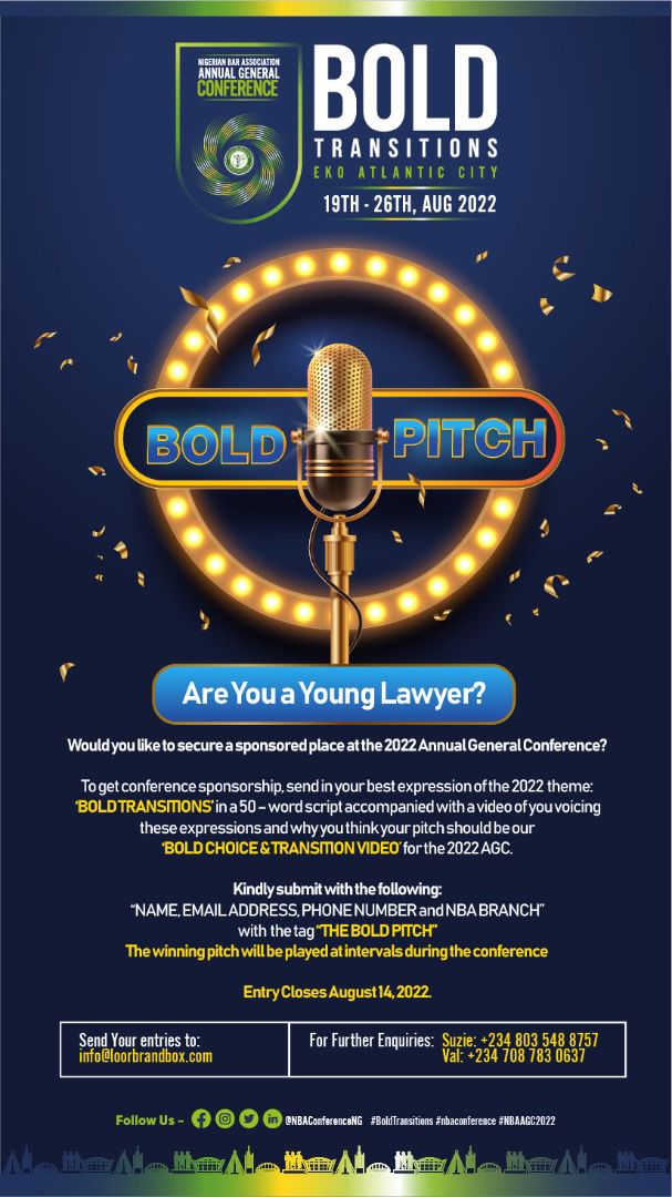 The contest, tagged THE BOLD PITCH, requires interested young lawyers to send in a script and video of themselves expressing their idea of the theme of the 2022 Annual General Conference.