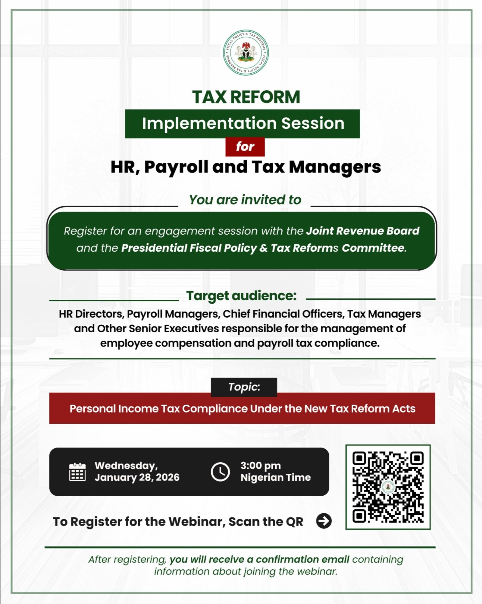 To ensure smooth implementation and compliance, the Presidential Fiscal Policy and Tax Reforms Committee, in collaboration with the Joint Revenue Board (JRB), has announced a special engagement session for key stakeholders.