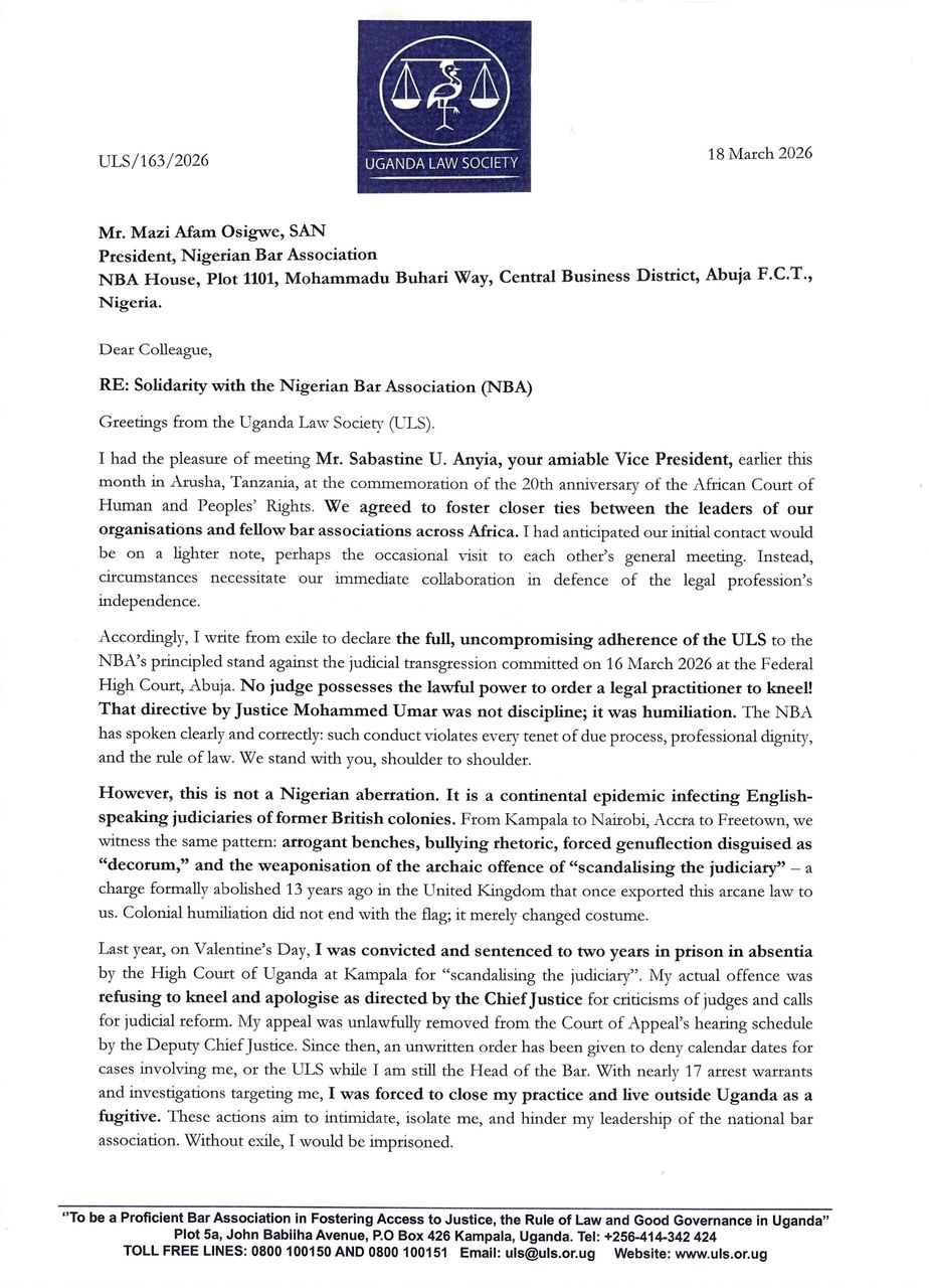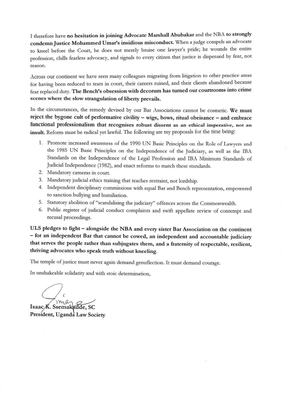 In a letter addressed to the President of the NBA, Mr. Mazi Afam Osigwe, SAN, the President of the ULS, Ssemakaade, SC, conveyed strong condemnation of the incident involving Justice Mohammed Umar, describing the directive allegedly issued to a legal practitioner to kneel in court as a violation of due process, professional dignity, and the rule of law.