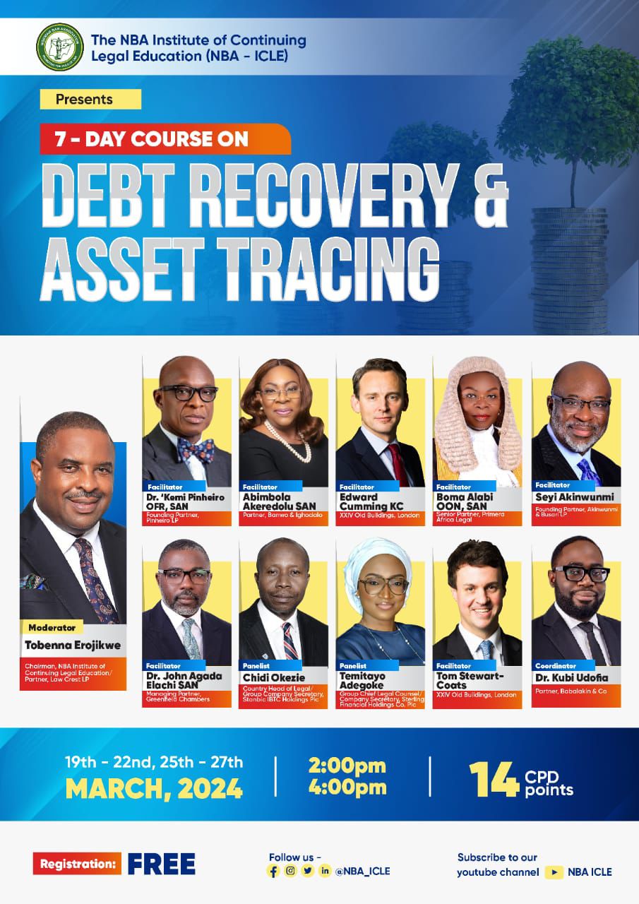 The Nigerian Bar Association Institute of Continuing Legal Education (NBA-ICLE) is set to host a comprehensive 7-day training course on debt recovery and asset tracing, as announced by Tobenna Erojikwe, Chairman of the NBA Institute of Continuing Legal Education (NBA-ICLE). The training, scheduled for March 19–22 and 25–27, 2024, aims to equip NBA members with the necessary knowledge and practical skills to effectively handle debt and asset recovery matters.
