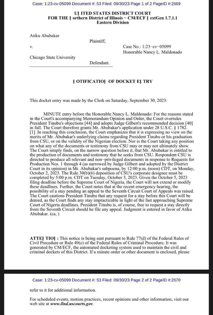 “CSU is directed to produce all relevant and non-privileged documents (such as Tinubu’s admission records, transcripts, and any other documents related to his education at CSU) in response to Requests for Production Nos. 1 through 4 (as narrowed by Judge Gilbert and adopted here) in Mr. Abubakar’s subpoena, by 12:00 p.m. (noon) CDT, on Monday, October 2, 2023,” she added. “The Rule 30(b)(6) deposition of CSU’s corporate designee must be completed by 5:00 p.m. CDT on Tuesday, October 3, 2023. Given the October 5, 2023, filing deadline before the Supreme Court of Nigeria, the Court will not extend or modify these deadlines.”