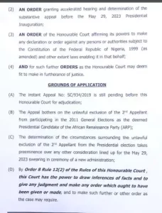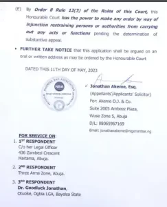 A statement by his legal counsel, Jonathan Akeme, released on Sunday, May 21, 2023, clarifies that the motion before the Supreme Court was filed on Monday, May 15, 2023, and there is an application to join President Muhammadu Buhari and the attorney general of the federation to the suit.