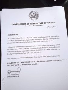 Wike also approved the payment of monthly pension arrears as well as death benefits for Retirees from the public service.